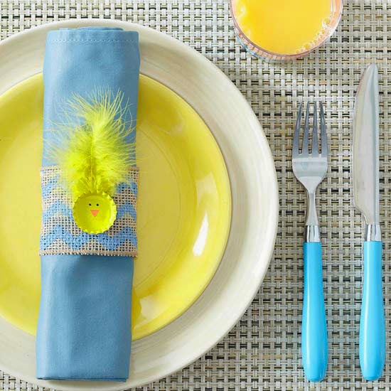 Kids will love helping out with setting the Easter table if it means they get to use these adorable napkin rings! To make, paint a bottle cap yellow and let dry. Use a black paint marker to add eyes and a small orange triangle of paper for the beak. Add a yellow feather to the back of the bottle cap, and glue the chick to a piece of wide ribbon about 4-1/2 inches long. Glue a second smaller ribbon to the back to tie the napkin ring together.