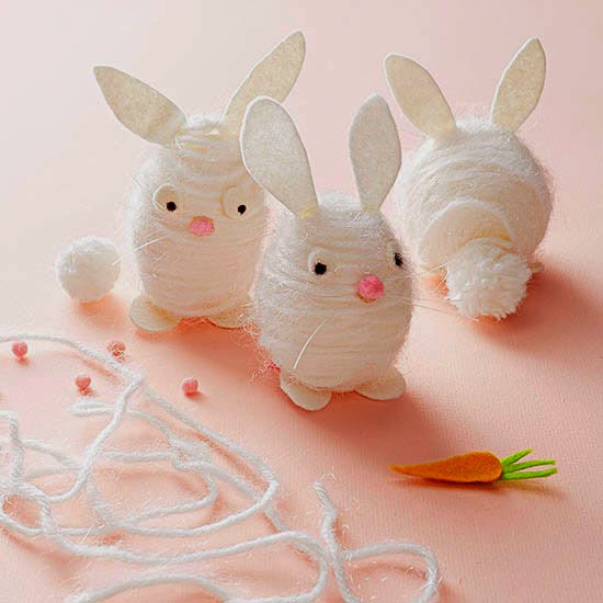 Older kids will love putting together these hippity-hoppity Easter bunnies! Apply strips of double-stick tape to plastic eggs. Starting at the top, wrap the egg in white yarn until fully covered. Tuck end in. Cut felt shapes to make the ears, feet, and eyes (use black marker for the dots on the eyes); glue to egg. Cut pieces of fishing line and glue to egg for whiskers. Glue a small pink pom-pom for a nose and a medium white pom-pom for the tail.