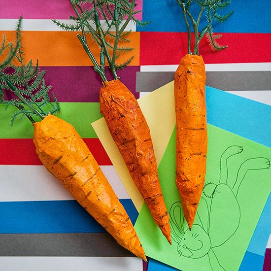 Your Easter bunnies will love these papier-mache-covered pens. Start by taping sprigs of plastic greenery to a pen. Mold aluminum foil around the pen to form a tapered carrot shape. Secure with masking tape. In a bowl, whisk 1/2-cup flour into 1/2-cup water. Dip strips of newspaper into the mixture, then wrap around the foil. When the foil is covered, let dry completely. To get the best color, first paint each pen white and let dry, then paint it orange. Using a fine paintbrush and brown paint thinned with water, decorate the carrot with little dots and lines.