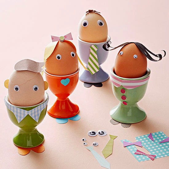 Replicate the whole family for a fun Easter display! Using decorative kraft paper, cut out details, such as a hair bow, tie, collars, and buttons. Glue them onto blown-out eggs. For curly hair, coil paper strips around a pencil. Heart-shape cutouts glued to the bottom of egg cups make shoes, and googly eyes add a finishing touch.