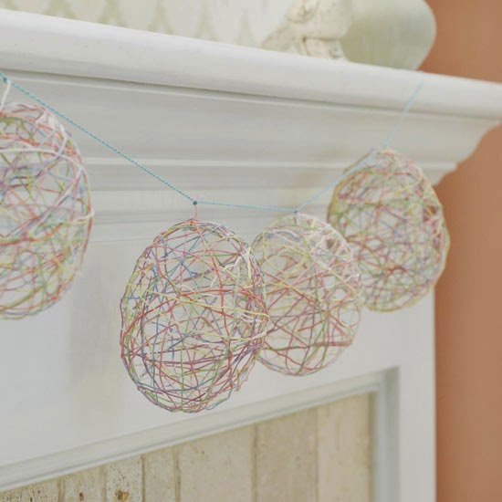 For an Easter craft the whole family can enjoy, try this easy garland of embroidery-floss Easter eggs. Prepare a bowl of stiffener mixture (we used 1 cup of liquid starch mixed with 1/2 cup of flour) and gently coil embroidery floss into the bowl. Blow up a water balloon to the desired size of your egg, and wrap the floss around the balloon, using multiple colors if desired. Let the finished product dry for several hours, then pop the balloon to reveal your egg. Hang several eggs with another strand of floss by tying the floss to the top of each egg.