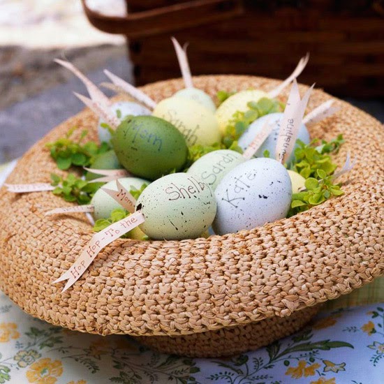 Improvise a pretty Easter basket using a simple straw hat. Fill it with softly colored eggs, either real or artificial. Hollowed-out eggs can be stuffed with paper ribbons that include spring wishes, egg-hunting clues, or even names for place cards.