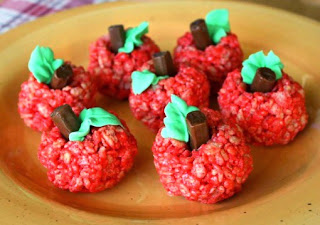 You will need red Jell-o to add to your batch of Rice Krispies after you melt the marshmallows. Place marshmallows and butter in large microwave-safe bowl. Microwave on high for 2 minutes. Stir and microwave for an additional minute. Remove from microwave and stir in jell-o powder. If desired, you can add a few drops of red food coloring (depending on how “red” your jell-o is). Add Krispy Rice cereal and stir well. Spray hands with baking spray and roll mixture into balls (a little larger than a golf ball) and drop on wax paper. After balls have set for a few minutes, use your thumb to press into the top to make an “apple” shape. Add a small tootsie roll “stem” and using royal icing (or any green candy), pipe on a “leaf”. I actually would have rather used some kind of green candy but didn’t have any on hand. I just used royal icing and a leaf-shaped icing tip.