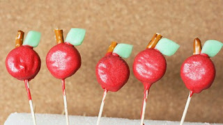 Supplies for mini Oreo pops: Mini Oreos, Red candy melts, Airheads ~ Watermelon flavored (for the green color) as the mini leaves, Pretzel sticks ~ for the mini stems and Toothpicks. First take a toothpick and gently stuck it into the middle (cream) part of the mini Oreo. This is to help with dipping the cookie into the candy melts. Melt the candy melts according to the directions on the bag. It only takes a little bit of time in the microwave and you’re good to go. Gently dip the cookie into the melted candy until covered completely. Carefully tap the toothpick on the side of the bowl to let the excess candy drip off of the cookie. Then stick the dipped cookies into a piece of styrofoam to let them dry completely. Don’t worry about messy toothpicks or extra drips, you’ll be removing the toothpicks later on. While the candy is still wet, break the pretzel sticks into small pieces (roughly 1/2 inch pieces) and stick into the top of the dipped Oreo. To create the little leaves simply use scissors to cut the Airheads into small pieces, then pinch and round the sides with fingers to make them into more of a leaf shape. Use a dab of melted candy to stick the leaves on the tops of the “apples” right next to the pretzel stem. Let everything dry completely. It takes less than 30 minutes to dry, or you can put them in the fridge to speed up the process. Once dry remove the messy toothpicks. Note: If you can keep the toothpicks clean you could leave them in and display them in a clean piece of styrofoam inside a cute container if you want as well.