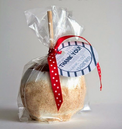 Supplies: Cellophane bags, Ribbon, Printable thank you tags, Circle punch, and Hole punch. Instructions: The caramel apple packaging is really quite easy to put together. All you do is place the caramel apple in a cellophane bag, then tie ribbon around the base of the wooden stick. Cut out the thank you tags (printable available below), and punch with a 3 inch punch. Tie the thank you tag to the ribbon and viola!