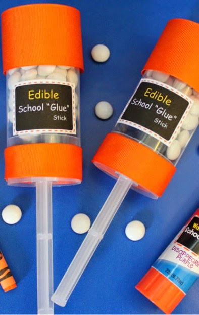 What you’ll need: Push-Up Pop containers (available on Amazon and Shop Sweet Lulu), 1 ½ inch orange grosgrain ribbon, York Peppermint Pieces, Glue dots or double sided tape, Scissors (scallop circle punch optional), printable school tags and White string or thin ribbon. Here are the simple steps: Fill the bottom of the push-up-pops container with a layer of blue candies, about ½ inch thick. Fill the remainder of the push-up-pops container with white candies. Tape the top of the push-up-pops container closed. Cut two pieces of orange ribbon, the length of the circumference of the container. Fold one piece of ribbon in half, lengthwise, securing it with glue dots. Attach it around the bottom edge of the push-up-pops container using the glue dots. Wrap the other piece of ribbon around the top of the push-up-pops, securing to the bottom edge of the container lid. The taller ribbon at the top will mimic the cap of the glue stick. Print the Edible School “Glue” Stick label on a full sheet of white sticker paper or regular paper and attach with tape. Print the I’m so happy to be “stuck” with you tag on cardstock. Punch out the tag and attach with string or ribbon. Now you’re all set to show your teachers how excited you are about this new school year! Enjoy!