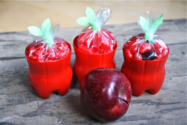 Supplies: 12 oz plastic drink bottles, red spray paint, a sharp knife or kitchen scissors, leaf punch, green cardstock, green pipe cleaner or twist ties, red candy, clear treat bags, glue or glue dots. Punch 2 leaves per “apple” and set aside. Find the seam on the bottle, stick the knife or scissors in and cut all the way around. The plactic won’t be sharp but you can go around again with scissors to even it out. Spray paint the “cups”. After they are all dry… it’s time for the fun part. Fill the treat bag up with red candy, use a snippet of pipe cleaner or twist tie to close it and secure the leaves on there with a drop of glue or a glue dot. Any kind of small red candy will do!