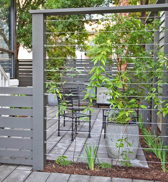 Cable wires mounted between fence posts create a sturdy support for climbing plants. Over time the plants will fill in the area, providing privacy for your patio.