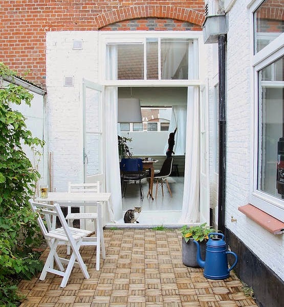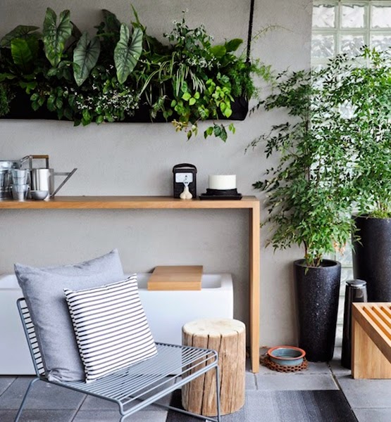 Wall-mounted planters add extra green when floor space is at a premium. A slender console table is another smart addition to this patio, providing space for candles, watering supplies and extra seating tucked underneath.