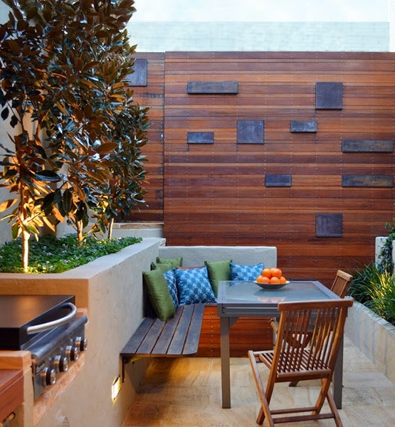 Map out your patio space on paper before making any changes—you may realize you can fit more than you thought. In this small space, the designer squeezed in a grill, a dining area, and built-in planters.