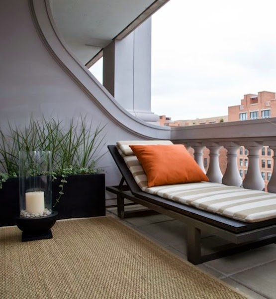 Forget sharing: Make your patio all about you. Place one lounge chair lengthwise, plump it up with comfy pillows, roll out a simple mat beside it and finish the area with a few potted plants.