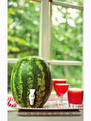 I LOVE, LOVE, LOVE this “keg” and it’s so simple to make! Just lop off one end of the melon to get it to stand upright, scoop out the flesh from the other, whiz that with any clear spirit in a blender, pour the liquid back into the rind, and top with ice. You can buy a spigot online for about $3.99.
