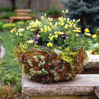 One great thing about spring is that moss-lined baskets and other containers don’t dry out as fast — so you don’t have to water them as much. Here, a basket is filled with favorites including purple coralbells and yellow osteospermum and snapdragon. A mix of sweet alyssum and creeping Jenny cascades down the sides. As they get going, they’ll eventually cover up the moss.