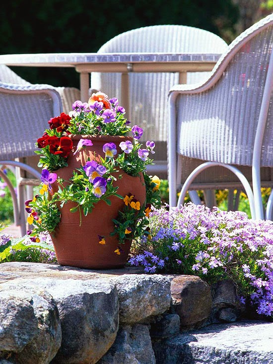 A gorgeous spring container garden doesn’t have to be complicated. Here, a variety of pansies and violas add charm and color to a strawberry jar. Use a mix of colors for a flamboyant look, or limit your pansies to one color for a more elegant, soothing presentation.