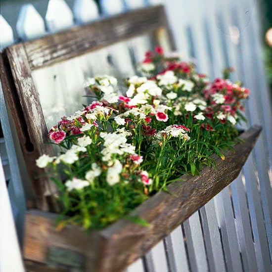 The best container gardens don’t just look good — they smell great, too. Incorporate a few fragrant plants into your containers and be sure to site them where you can enjoy them. For example, here dianthus hangs from a picket fence, bringing it that much closer to nose level.