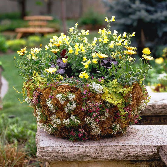 One great thing about spring is that moss-lined baskets and other containers don’t dry out as fast — so you don’t have to water them as much. Here, a basket is filled with favorites including purple coralbells and yellow osteospermum and snapdragon. A mix of sweet alyssum and creeping Jenny cascades down the sides. As they get going, they’ll eventually cover up the moss.