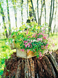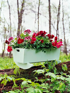 A painted wooden garden trug turns into a focal point with annual Dianthus and trailing Dichondra to create an abundant and informal look. (Tip: Line the bottom of the container with heavy plastic, or set pots into plastic water trays.)