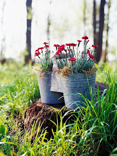 Two petite galvanized buckets connected by a crosspiece and simple handle are the perfect planting place for perennial Dianthus, or pinks. Spur Dianthus to send up a second flush of blooms by shearing off spent flowers. The plants will bloom well into summer when grown in part shade to full sun and watered regularly.