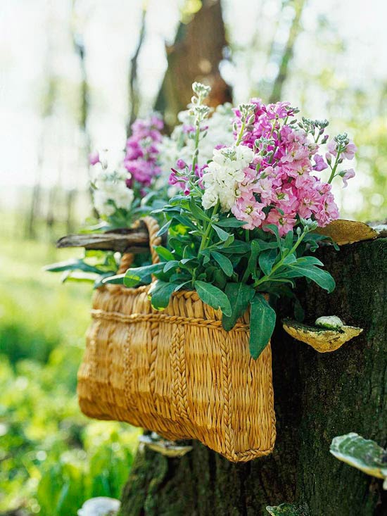 Sweetly perfumed stock revels in cool conditions. The handles on a loosely woven basket make it easy to hang this fragrant treasure where you are likely to walk by and enjoy the scent. An excellent cutting flower, stock is available in shades of white, pink, purple, red, yellow, and orange.