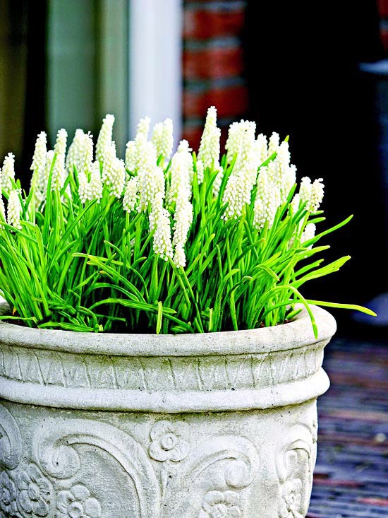 When repotting sprouted bulbs, such as white Muscari, tightly arrange them for the best effect.