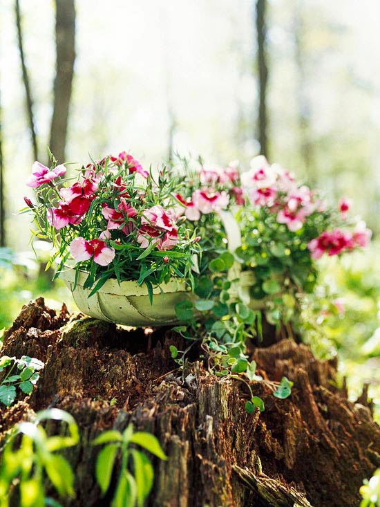 A painted wooden garden trug turns into a focal point with annual Dianthus and trailing Dichondra to create an abundant and informal look. (Tip: Line the bottom of the container with heavy plastic, or set pots into plastic water trays.)