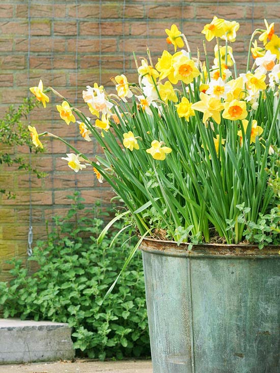 An old metal container gets a new life when used for a pretty planting of spring daffodils.