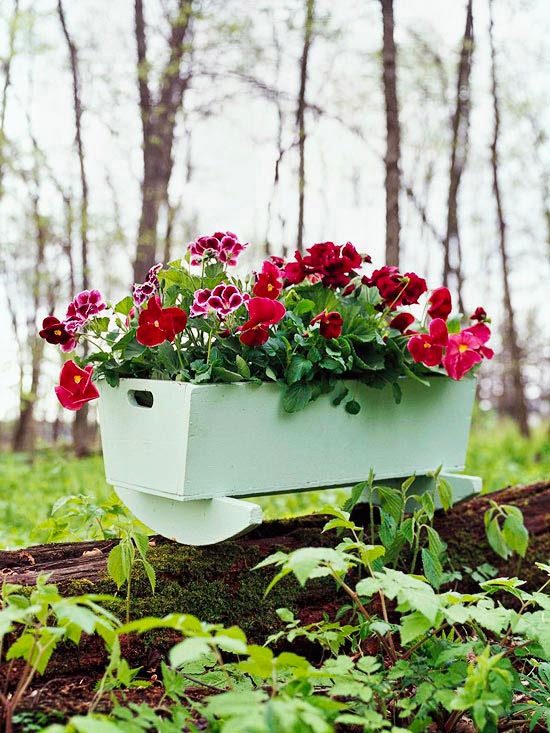 Plum-and-white Regal geraniums (Pelargonium spp.) are tucked in by cheery deep pink pansies (Viola x wittrockiana) in a doll-size planter. A coat of exterior wood sealant protects the cradle from moisture. For long-lasting plantings, drill drainage holes in watertight containers. If that isn’t possible, water only to lightly moisten the soil and let the potting soil dry slightly between waterings.