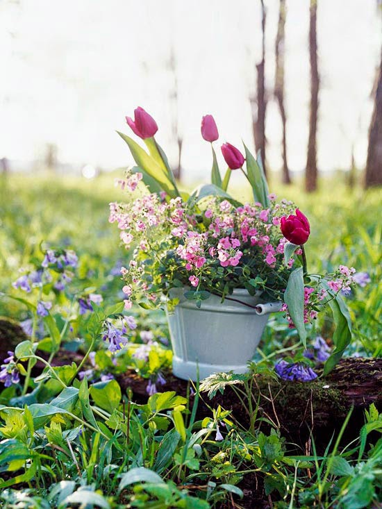 Tulips, daffodils, and hyacinths are bellwethers of spring. In this simple ceramic bucket, a skirt of light pink Diascia surrounds a clump of magenta tulips. Prolong the life of your plantings by purchasing plants with tightly closed buds. The buds will open in a few days and color your container for two or more weeks.