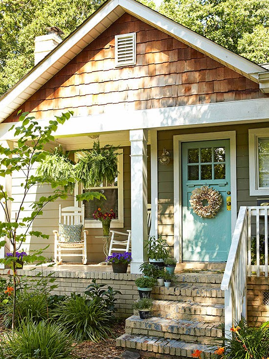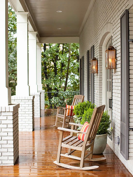 Just like indoors, simply adding a fresh coat of paint to the exterior of a house can change the entire look. Here, taupe paint gave old red brick a new, cleaner look. Since the porch isn’t very wide, the furniture couldn’t be bulky. Rocking chairs and potted shrubs convey a simple, symmetrical, and unified look.