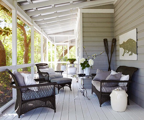 This wrap-around, screen porch uses several different types of materials to create visual interest. A metal table pairs well with the dark wicker furniture, porcelain garden stool, and worn wooden oars propped up in the corner. A mix of gray and white pillows keeps the color palette laid-back and subdued.