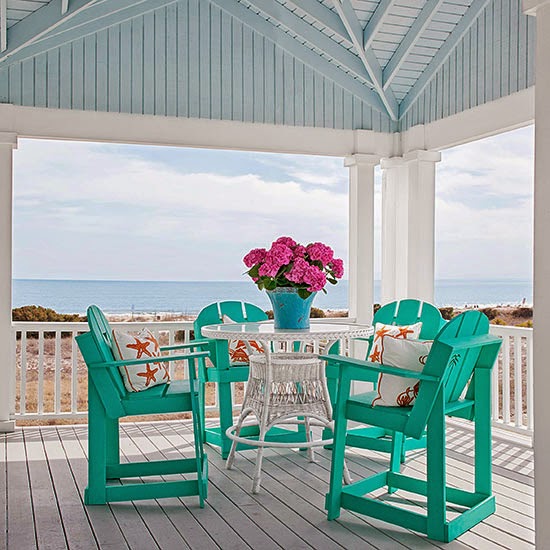 Have fun with color and paint on your porch. Consider an eye-catching paint color for the ceiling. Here, sky blue mimics the real deal and is bright even on cloudy days. Reserve saturated, intense colors for furniture and accessories, like these teal chairs and orange patterned pillows.