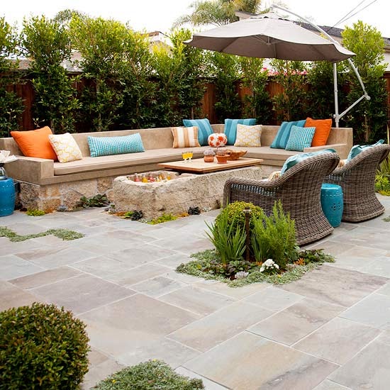 To eliminate wasted space behind furnishings, the patio seating was placed in a corner, along the perimeter. This also helps create the feel of a room between the house and the seating. Having a laid out space plan prior to starting work is always a great idea. Small patios rule out large gardens, but tall trees and lush greens provide privacy along the fence. The patio’s designer, Chris Fenmore of Garden Studio Design, suggests placing taller plants behind smaller ones to create an illusion of depth and make the space seem grander.