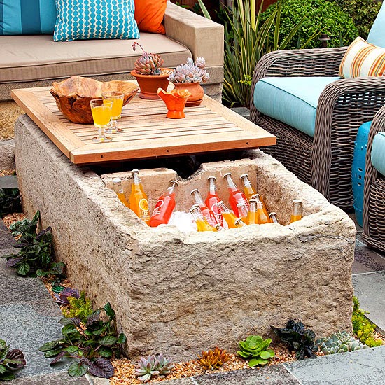 A creative “coffee table” fashioned from an old horse trough serves many purposes. One side is a drink cooler, and the wood top can be moved so the drink cooler is easily accessible on those steamy days.