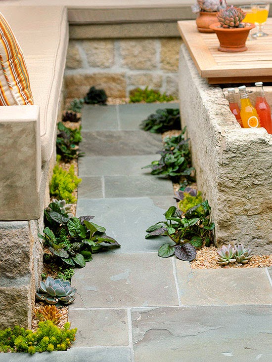Small slivers of leafy greens poke through the patio floor, outlining the seating and table. These small slivers of green add great contrast and color to the patio, which has limited planting space.