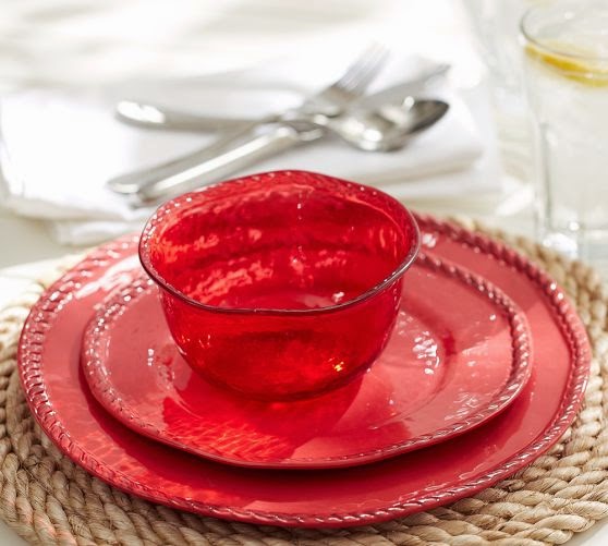 Rope Outdoor Dinnerware, Red ~ This all-melamine collection lets you dine outdoors all summer long. Each rope-trimmed piece bears the beautiful appearance of hand-painted and -glazed Italian country ceramics, but is completely unbreakable. Mix and match these plates to set a table that’s both stylish and easy.