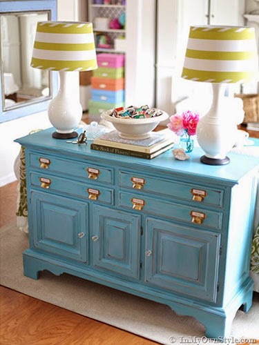 Surface Spruce-Up ~ Sometimes, all an old piece of furniture needs is a new paint job. The creative force behind In My Own Style gave this hand-me-down sideboard a special glazed-distressed finish in a lively turquoise hue, using homemade chalk paint.