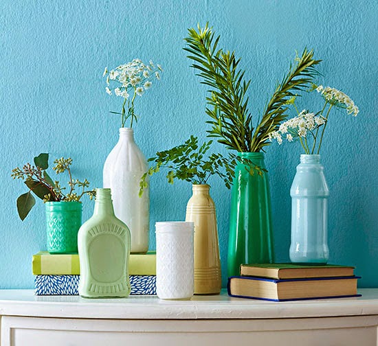 Set a pretty display with painted glass bottles that look like milk glass. Wash the glass with soap and water; let dry. Dampen a cloth with rubbing alcohol, and wipe the inside of the glass vessel with the cloth. For narrow vessels, pour a small amount of rubbing alcohol inside, swirl around, and pour out excess; let dry. Mix two parts acrylic paint with one part water in a glass bowl and pour into the bottle or jar. Swirl the paint around inside the bottle or jar until the entire interior is coated. Place the glass vessel upside down on a paper towel or paper plate to dry. Repeat painting steps until you are happy with the coverage. Note: These bottles are for display only; do not use with food or drink.