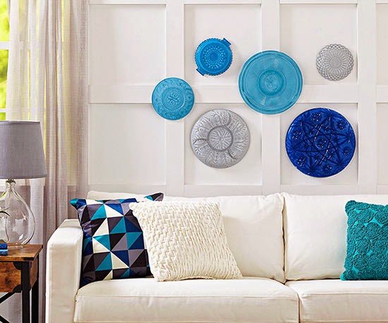 Who doesn’t have old trays lying around, especially the plastic ones you get from a meat, veggie or fruit tray? Rescue those those or the cast-off crystal platters grandma gave you and turn them into one-of-a-kind artwork. Paint the smooth sides of the platters with two to three coats of acrylic paint (you can spray paint as well); let dry between coats. Mix and match colors, sizes, and patterns and hang the platters together in a grouping.