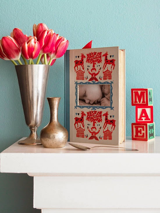 Don’t let an old book with damaged pages go to waste. If it has a beautiful cover, you can turn it into a pretty frame. Using a crafts knife, carefully cut a rectangle out from the front cover. To create the mat, cut a few of the inside pages into a rectangle a bit smaller than the cover rectangle. Glue the pages to the cover and tape a photo in place. Great for shower gifts and the up coming holidays, simply find a “coordinating” theme book!