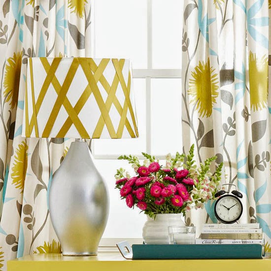 Give a plain lampshade a boost with ribbon. Wrap ribbon vertically around the shade, overlapping to create a dynamic design. Secure the ribbon with pins and glue. Do you have another hour? Transform the lamp base, too. Paint the base a fresh shade. Tip: Metallic paints reflect best on a smooth surface and simple shape.