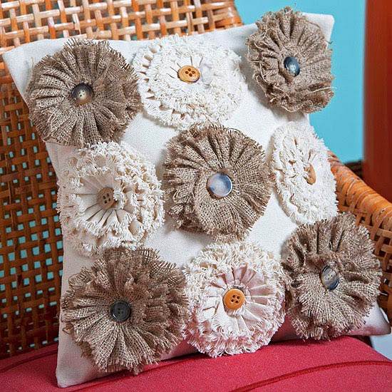 No-Sew Burlap Blooms Pillow ~ Dress a pillow in cozy fall textures without sewing a stitch in this fun fall crafts project. Layer and secure purchased burlap-and-canvas flowers of different sizes using fabric adhesive. Top each flower center with a button, and adhere the flowers to the pillow, arranging as desired.
