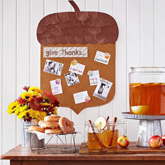 Give Thanks Corkboard ~ Get ready to celebrate fall with an acorn-shape corkboard that inspires you to give thanks. Simply cut an acorn shape from purchased corkboard and use punched cardstock cirlcles to create the cap. Hang it in your kitchen, at a party, or save it for Thanksgiving. Bonus: Kids will love helping fill the board with their favorite things.