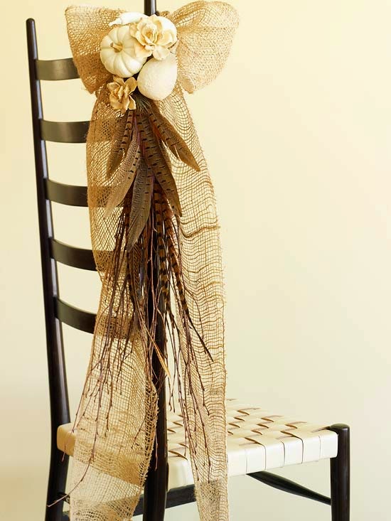 Chair Decoration ~ Give a chair neutral natural elegance. Tie a jute ribbon in a bow around one chair post. Gather twigs and pheasant feathers so the feathers fan out. Secure to the chair with crafts wire. Spray-paint small pumpkins and gourds white. Hot-glue three or four to hide the wire. Finish by inserting white dried flowers.