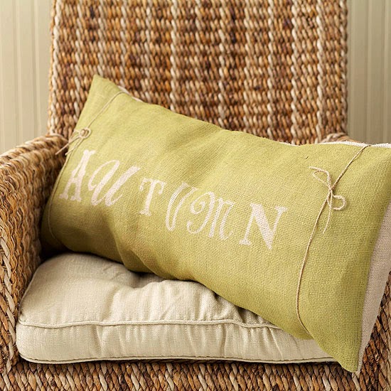Autumn Pillow ~ Celebrate the weather change with a pillow that announces the season. Lay a pillow cover on a flat surface and arrange large chipboard letters across it. Use repositionable spray adhesive to adhere the letters. Spray the pillow cover with fabric paint in your desired fall color; let dry. Remove the chipboard letters and insert a pillow form in the cover. Tie jute twine in bows near the ends for even more texture.