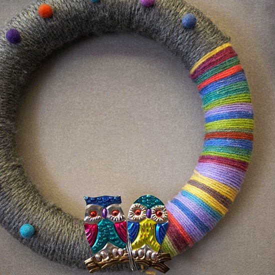 Yarn Wreath with Owls ~ This couldn’t-be-easier fall wreath works with any of your favorite motifs: owls, leaves, pumpkins, and more. Simply wrap a foam wreath with yarn, alternating colors as desired and securing with hot glue. Use a bit of yarn to secure a brooch or tin embellishment, such as these owls. Finish by hot-gluing pom-poms around the wreath and adding a hanging loop.
