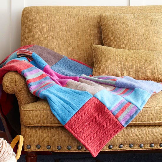 Sweater Throw ~ Get cozy on the couch this fall with this fun fabric throw made from upcycled wool sweaters. Decide the desired size of your throw and determine how many 9-inch squares of felted wool fabric you will need; we made a few of our large squares by sewing four 5-inch squares with right sides together using a 1/2-inch seam allowance. Once you have all of your squares, arrange in an attractive pattern. Sew together rows of blocks using a 1/2-inch seam allowance, then sew the rows together, matching the seams. Back the quilt with a cozy flannel sheet, sew perle cotton ties at the intersections, and then topstitch 1-inch from the edge around the perimeter to finish. Fall Crafts Tip: To create the nonraveling fabric, turn the pieces inside out and toss into the washing machine on a hot-cycle wash with detergent; machine- or air-dry.