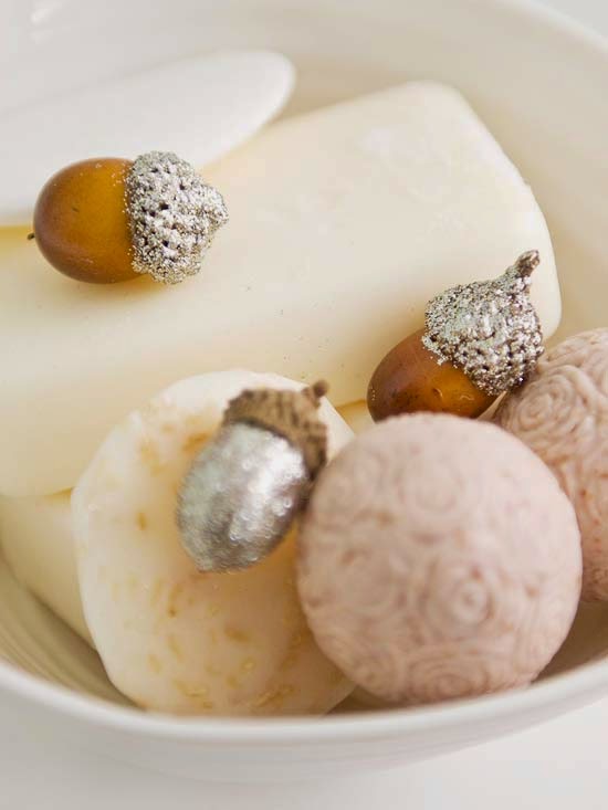 Glitzy Acorns ~ Use acorns as a sophisticated display in your home. Mix silver glitter with silver paint and coat the acorn caps or the acorn body. Group them in a bowl for shine or scatter them with other natural elements for a pop of sparkle.