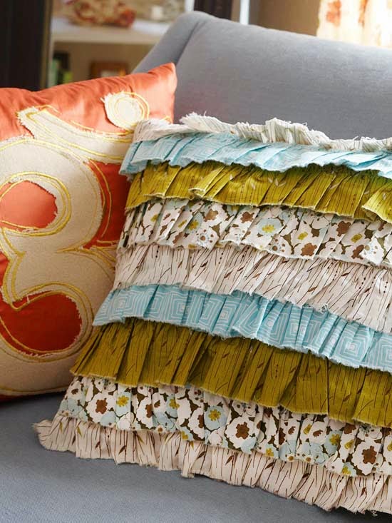 Ruffle Pillow ~ Update an accent pillow in less than an hour by adding pretty ruffles to the cover. Coordinate the different fabrics with existing furniture or linens to refresh the look of a room for fall. Pattern Here.