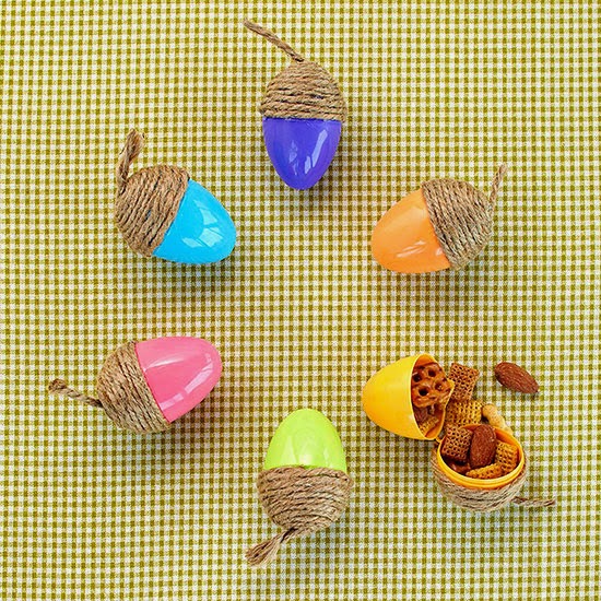 Acorn Treats ~ Go nuts! Make adorable acorn treat holders this fall. Not only are they great for sending in school lunches, but the easy fall craft is a thoughtful party favor or decoration, too. To make, simply hot-glue twine around the wide end of a plastic Easter egg, then fill with snacks, candy, or other fun treats.
