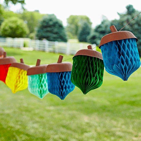 Acorn Garland ~ This fun acorn garland is a creative way to get the kids excited for fall. Start by taking purchased paper globes and tracing the shape of half of an acorn onto the unopened decoration; cut out. Trimmed and painted paper bowls are topped with painted wine corks to complete the caps. Hot-glue caps to opened tissue-paper acorns and string together using a long length of burlap twine tied around each acorn stem.